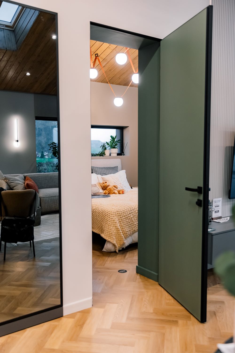 В активной зоне кварцевый ламинат уложен единым полотном, он подчёркивает целостность пространства и создает ощущение порядка. Это современный дом с качественными материалами, где комфорт чувствуется сразу — без лишних объяснений.